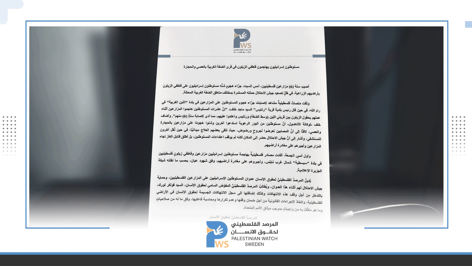 يُدينُ المرصدُ الفلسطينيُّ لحقوق الإنسان عدوان المستوطنين الإسرائيليين على المزارعين الفلسطينيين، وحماية جيش الاحتلال لهم أثناء هذا العدوان، ويُطالبُ المرصدُ الفلسطينيُّ المفوّض السامي لحقوق الإنسان، السيد فولكر تورك، بالتدخل من أجل وقف هذه الانتهاكات وكذلك إضافتها إلى سجل الانتهاكات الجسيمة لحقوق الإنسان في الأراضي الفلسطينية، واتخاذ الإجراءات القانونية من أجل ضمان وقفها وعدم تكرارها ومحاسبة فاعليها، وفق ما له من صلاحياتٍ وما هو مكلّفٌ به من واجباتٍ بموجب ميثاق الأمم المتحدة.