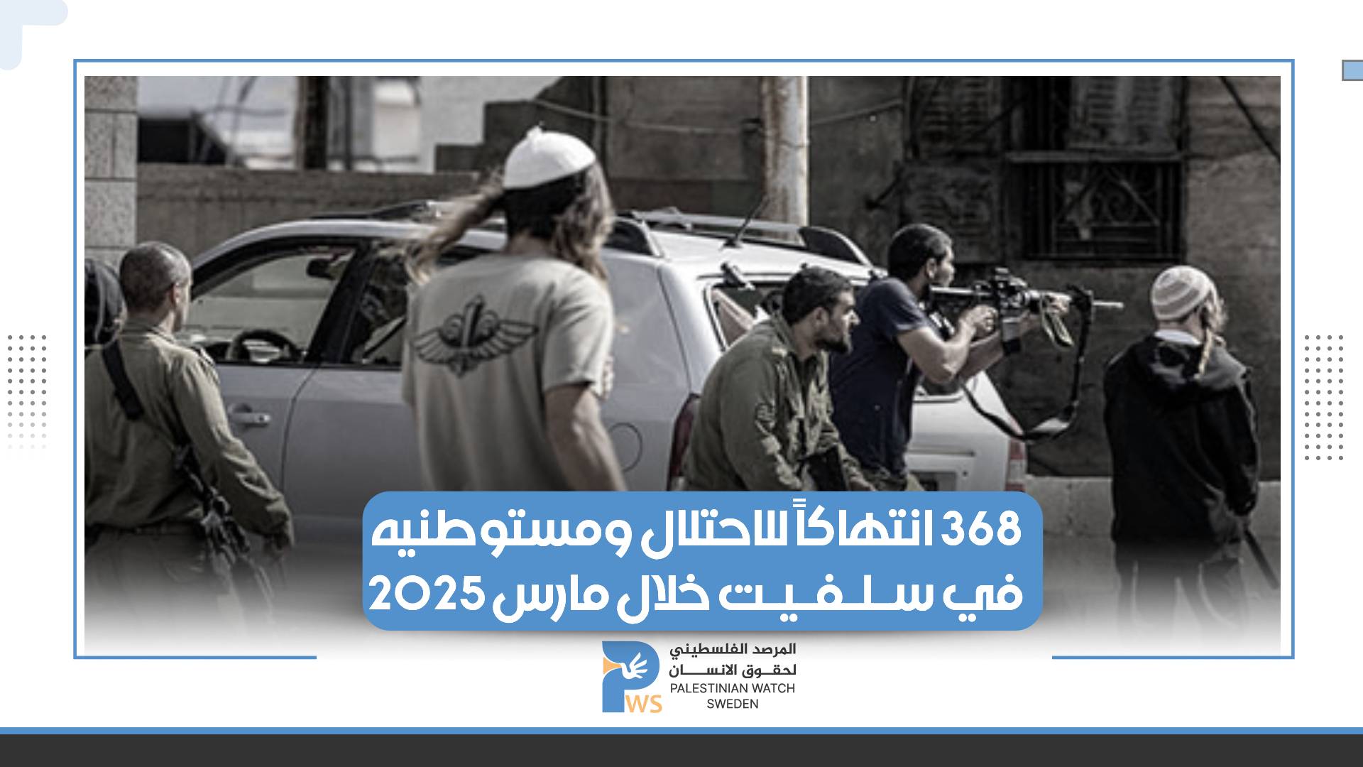 قالت محافظة سلفيت، إنها رصدت 368 انتهاكا ارتكبها الاحتلال الإسرائيلي والمستوطنون بحق المواطنين وممتلكاتهم في المحافظة، خلال شهر آذار/مارس الماضي.